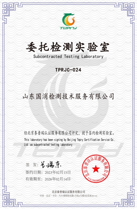 热烈祝贺山东国消取得北京泰普瑞认证有限公司签约检测实验室资格
